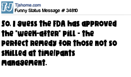 - # 29163 So, I guess the FDA has approved the "week-after" pill - the perfect remedy for those not so skilled at time/pants management...