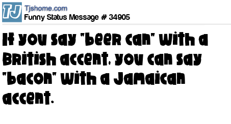 - # 85196 Did you know if you say "beer can" with a British accent, you have also just said "bacon" with a Jamaican accent?