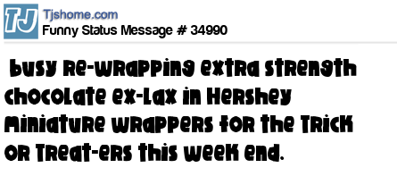 X busy re-wrapping extra strength chocolate ex-lax in Hershey miniature wrappers for the Trick or Treat-ers this week end.