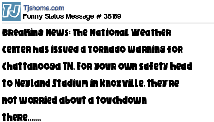 X is Breaking News: The National Weather Center has issued a tornado warning for Chattanooga TN. For your own safety head to Neyland Stadium in Knoxville, they're not worried about a touchdown there.......