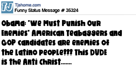 X Obama: "We Must Punish Our Enemies" American Teabaggers and GOP candidates are enemies of the Latino people??? This DUDE is the Anti Christ.......