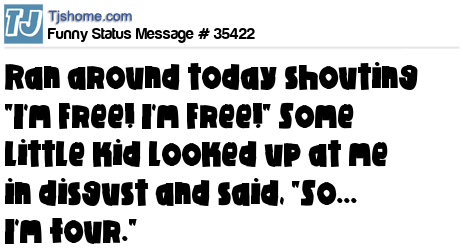 X Ran around today shouting "I'm Free! I'm Free!" Some little kid looked up at me in disgust and said, "So... I'm four."