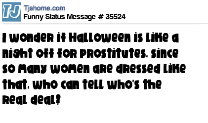 X is I wonder if Halloween is like a night off for prostitutes, since so many women are dressed like that, who can tell who's the real deal?
