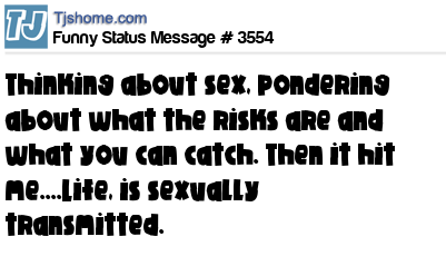 X is thinking about sex, pondering about what the risks are and what you can catch. Then it hit me....Life, is sexually transmitted.