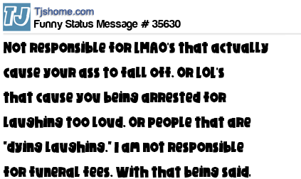 - # 30658 not responsible for LMAO's that actually cause ur ass to fall off. Or LOL's that cause you being arrested 4 laughing too loud. Or people that are "dying laughing" I am not responsible for... funeral fees. With that being said. Enjoy my wall.