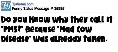 - # 161922 "Do you know why they call it 'PMS'? Because 'Mad Cow Disease' was already taken."