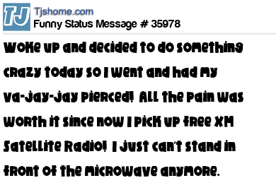 X Woke up and decided to do something crazy today so I went and had my va-jay-jay pierced! All the pain was worth it since now I pick up free XM Satellite Radio! I just can't stand in front of the microwave anymore.