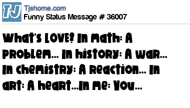 - # 33979 What's LOVE? In math: A problem. In history: A war. In chemistry: A reaction. In art: A heart. In me: Bull