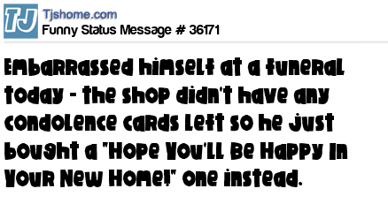 X has embarrassed himself at a funeral today - the shop didn't have any condolence cards left so he just bought a "Hope You'll Be Happy In Your New Home!" one instead.