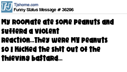 X My roomate ate some peanuts and sufferd a violent reaction...They were MY peanuts so I kicked the sh!t out of the thieving ba$tard...