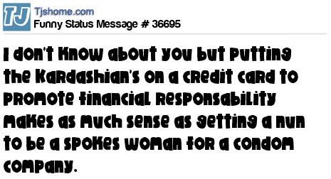 X  I don't know about you but putting the Kardashian's on a credit card to promote financial responsability makes as much sense as getting a nun to be a spokes woman for a condom company.