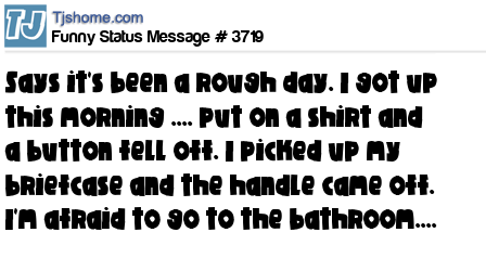 - # 14099 Its been a rough day. I got up this morning .... put on a shirt and a button fell off. I picked up my briefcase and the handle came off. I'm afraid to go to the bathroom