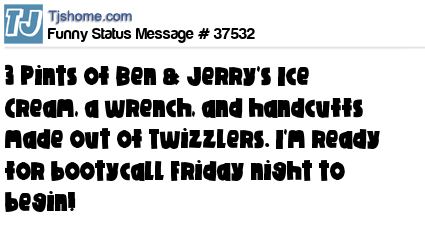 X is 3 Pints of Ben & Jerry's Ice Cream, a wrench, and handcuffs made out of Twizzlers. I'm ready for bootycall Friday night to begin!