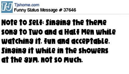X Note to Self: Singing the theme song to Two and a Half Men while watching it, fun and acceptable. Singing it while in the showers at the gym, not so much.