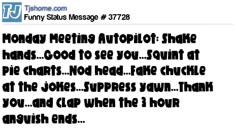 X is Monday Meeting Autopilot: Shake hands...Good to see you...Squint at pie charts...Nod head...Fake chuckle at the jokes...Suppress yawn...Thank you...and Clap when the 3 hour anguish ends...
