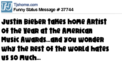 X says Justin Bieber takes home Artist of the Year at the American Music Awards...and you wonder why the rest of the world hates us so much...