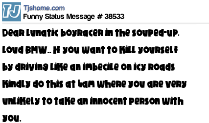 X is Dear lunatic boyracer in the souped-up, loud BMW.. If you want to kill yourself by driving like an imbecile on icy roads kindly do this at 4am where you are very unlikely to take an innocent person with you.