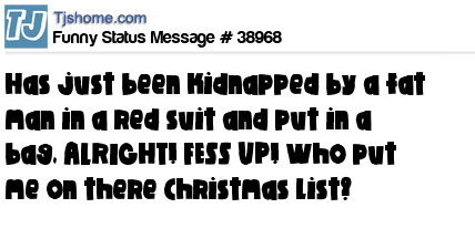 X is Has just been kidnapped by a fat man in a red suit and put in a bag, ALRIGHT! FESS UP! Who put me on there Christmas list?