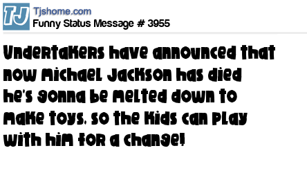 X Undertakers have announced that now michael Jackson has died he's gonna be melted down to make toys, so the kids can play with him for a change!