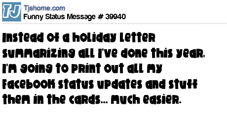 X Instead of a holiday letter summarizing all I've done this year, I'm going to print out all my Facebook status updates and stuff them in the cards... much easier.