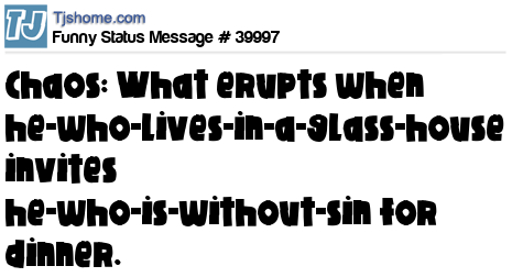 X says Chaos: What erupts when he-who-lives-in-a-glass-house invites he-who-is-without-sin for dinner.