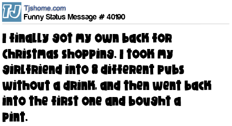 - # 41808 I finally got my own back for Christmas shopping: I took my girlfriend into eight different pubs without getting a drink and then went back into the first one and bought a pint.