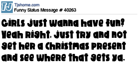 - # 81187 No Cyndi Lauper...you're so very wrong. Girls don't just wanna have fun...they want a whole lotta sh!t. Christmas blows. Sincerely - A broke boyfriend.