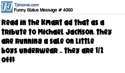 X read in the Kmart ad that as a tribute to Michael Jackson, they are running a sale on little boys underwear .. they are 1/2 off!