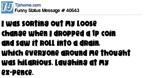 X I was sorting out my loose change when I dropped a 1p coin and saw it roll into a drain, which everyone around me thought was hilarious. Laughing at my ex-pence.