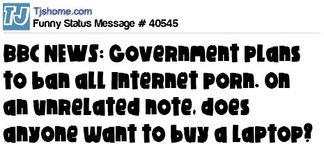 X BBC NEWS: Government plans to ban all Internet porn. On an unrelated note, does anyone want to buy a laptop?
