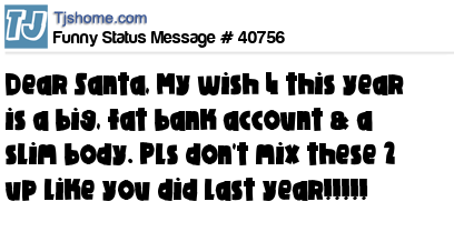 X says Dear Santa, My wish 4 this year is a big, fat bank account & a slim body. Pls don't mix these 2 up like you did last year!!!!!