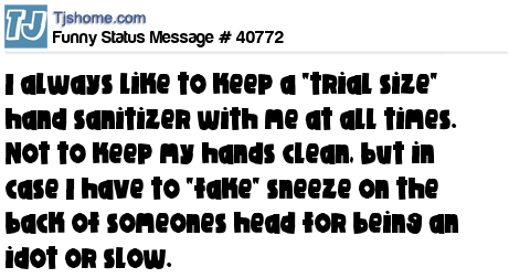 X I always like to keep a "trial size" hand sanitizer with me at all times. Not to keep my hands clean, but in case I have to "fake" sneeze on the back of someones head for being an idot or slow.