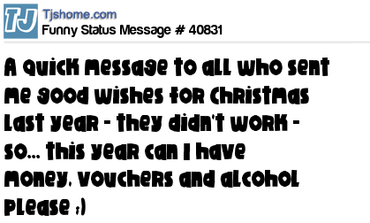 X is a quick message to all who sent me good wishes for Christmas last year - they didn't work - so... this year can I have money, vouchers and alcohol please ;)