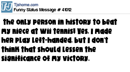 X says the only person in history to beat my niece at Wii tennis! Yes, I made her play left-handed, but I don't think that should lessen the significance of my victory.