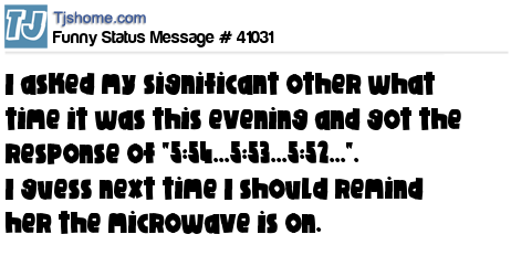 X says I asked my significant other what time it was this evening and got the response of "5:54...5:53...5:52...". I guess next time I should remind her the microwave is on.