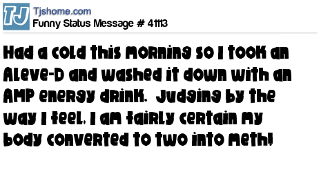 X Had a cold this morning so I took an Aleve-D and washed it down with an AMP energy drink. Judging by the way I feel, I am fairly certain my body converted to two into meth!