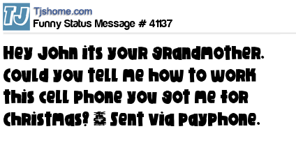 X Hey John its your grandmother. Could you tell me how to work this cell phone you got me for Christmas? ~ Sent via payphone.