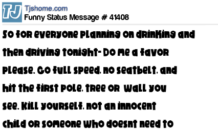 X says So for everyone planning on drinking and then driving tonight- Do me a favor please. Go full speed, no seatbelt, and hit the first pole, tree or wall you see. Kill yourself, not an innocent child or someone who doesnt need to drink to have a good