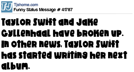 X is Taylor Swift and Jake Gyllenhaal have broken up. In other news, Taylor Swift has started writing her next album.
