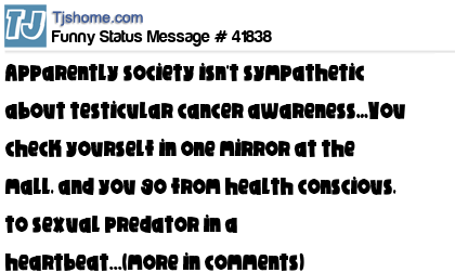 X Apparently society isn't sympathetic about testicular cancer awareness…You check yourself in one mirror at the mall, and you go from health conscious, to sexual predator in a heartbeat...(more in comments)