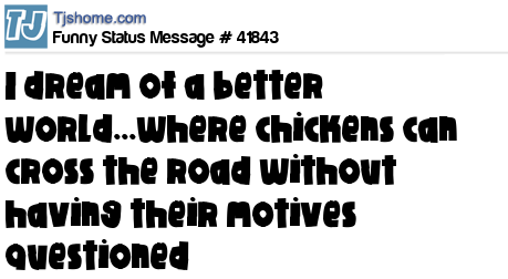 - # 167891 I dream of a world where chickens can cross the road without having their motives questioned.