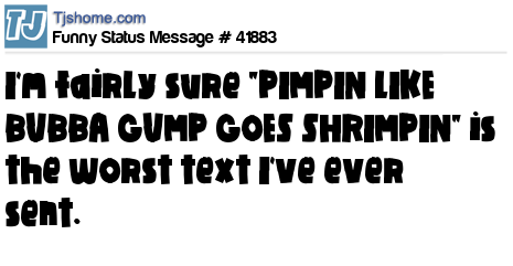 X I'm fairly sure "PIMPIN LIKE BUBBA GUMP GOES SHRIMPIN" is the worst text I've ever sent.