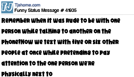 X says Remember when it was rude to be with one person while talking to another on the phone?Now we text with five or six other people at once while pretending to pay attention to the one person we're physically next to