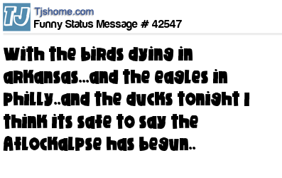 X is with the birds dying in arkansas...and the eagles in philly..and the ducks tonight I think its safe to say the Aflockalpse has begun..