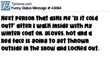 X Next person that asks me "Is it cold out?" after I walk inside with my winter coat on, gloves, hot and a red face is going to get thrown outside in the snow and locked out.