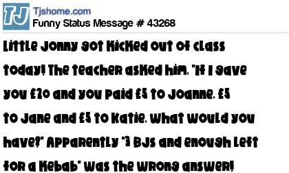 X Little Jonny got kicked out of class today! The teacher asked him, "If I gave you £20 and you paid £5 to Joanne, £5 to Jane and £5 to Katie, what would you have?" Apparently "3 BJs and enough left for a kebab" was the wrong answer!