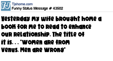 X says Yesterday my wife brought home a book for me to read to enhance our relationship. The title of it is. . . "Women are from Venus, Men are Wrong"