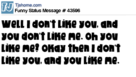 X is Well I don't like you, and you don't like me. Oh you like me? Okay then I don't like you, and you like me.