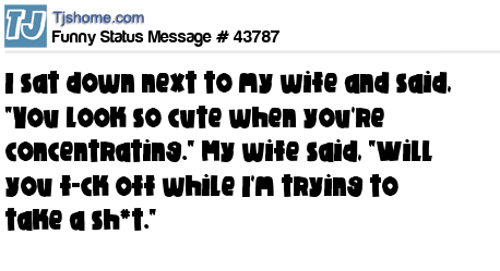 X I sat down next to my wife and said, "You look so cute when you're concentrating." My wife said, "Will you f-ck off while I'm trying to take a sh*t."
