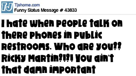 X I hate when people talk on there phones in public restrooms. Who are you?? Ricky Martin?!?! You ain't that damn important